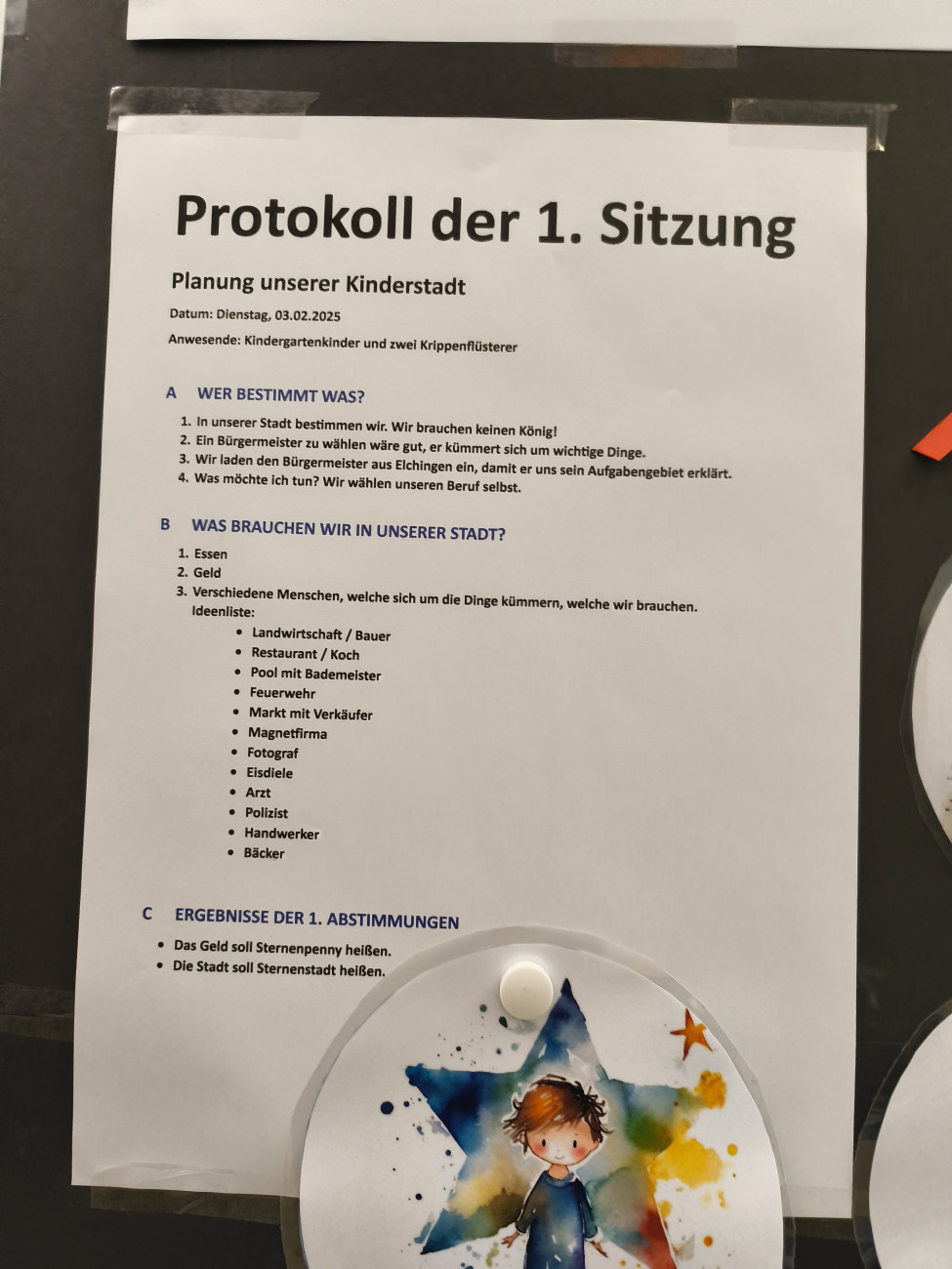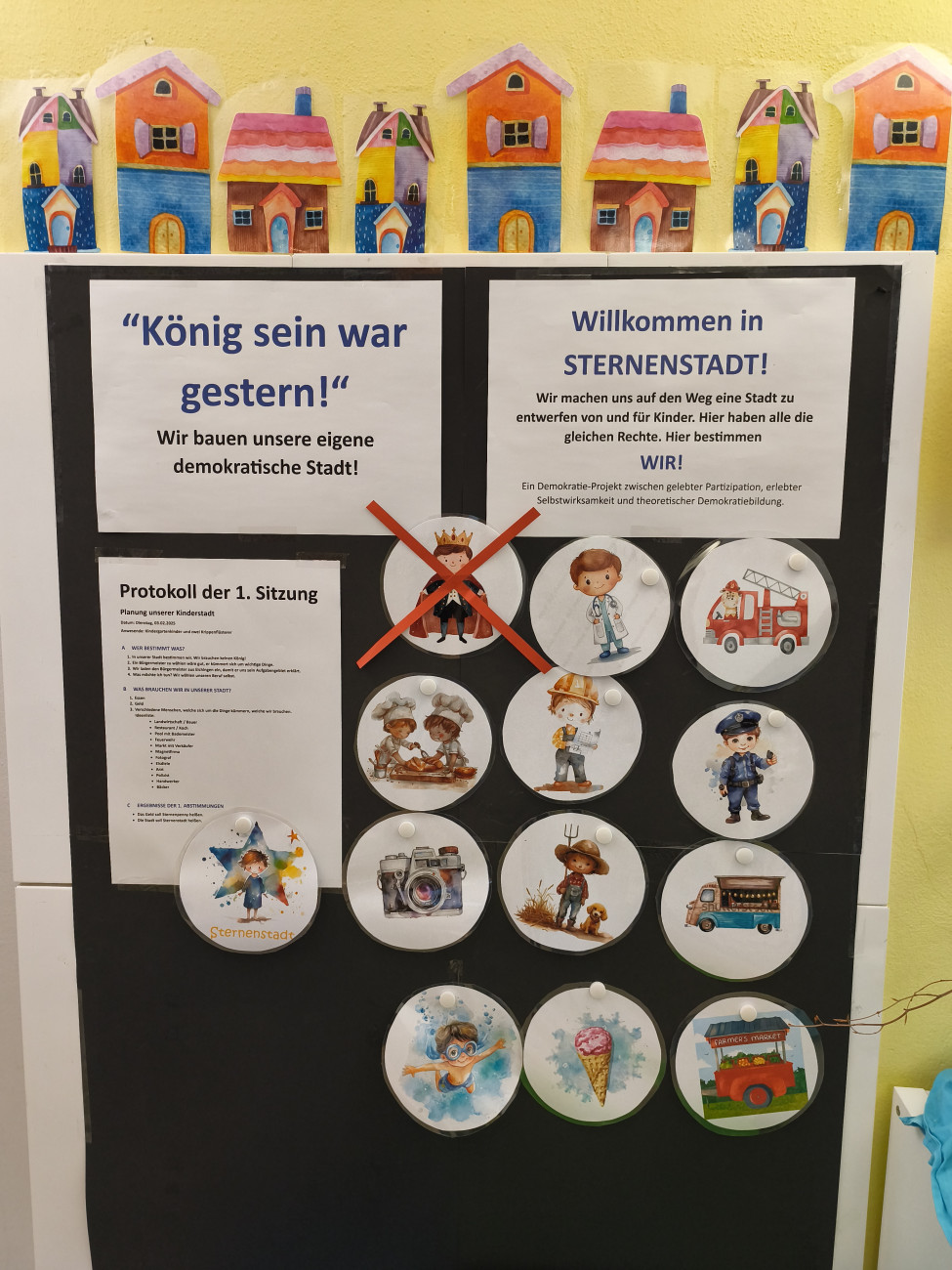 Die Vorschulkinder haben im Rahmen dieses Projektes die gesamte Elternbeiratswahl gestaltet. Nach längerer Auseinandersetzung mit der Thematik organisierten die Kinder diese Wahl autonom. Von der Suche nach Kandidaten, Erstellung der Stimmzettel, Aufbau eines Wahllokals für die anonyme Wahl, Wahlwerbung, Auszählung und dem Erstellen der Wahldiagramme etc. wurde alles von unseren Kindern übernommen.