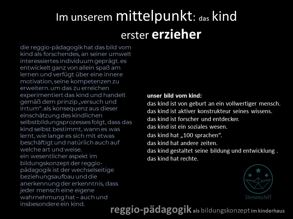 Der Reggio-Ansatz ist unser Bildungskonzept zur Umsetzung des "Bayerischen Erziehungsplanes". Hier finden Sie einen kurzen Überblick über die Reggio-Pädagogik.